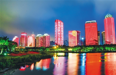 4月26日晚,海口滨海大道中环国际大厦等楼宇亮出“相约消博会 出彩新海口”等字样。据介绍,自4月27日起,海口滨海大道地标建筑将连续15天上演消博会主题灯光秀。 文/本报记者 计思佳 图/通讯员 苏弼坤
