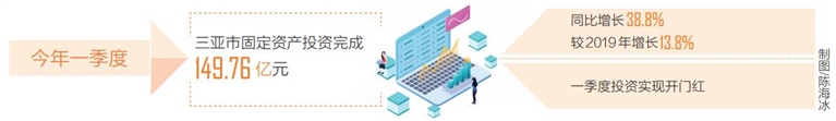 三亚市统计局数据显示,今年一季度,三亚市固定资产投资完成149.76亿元,同比增长38.8%,较2019年增长13.8%,一季度投资实现开门红。