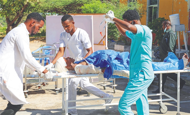 4月28日,医务人员在索马里摩加迪沙附近抢救在袭击中受伤的士兵。