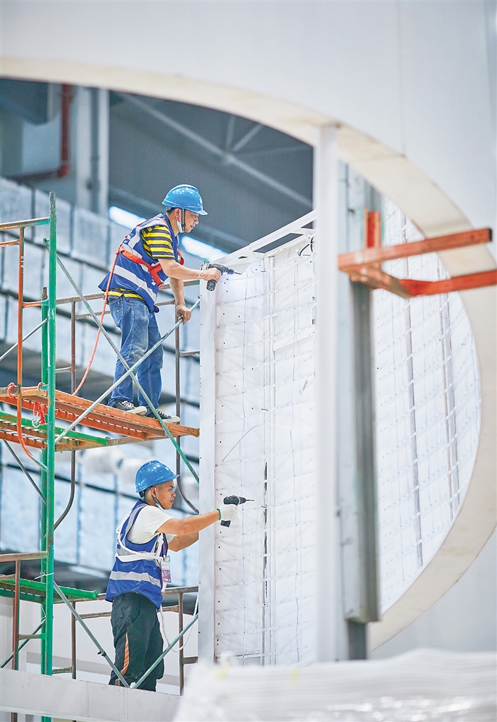 4月29日下午,工人们如火如荼地布置着首届消博会的展馆。本报记者 封烁 摄