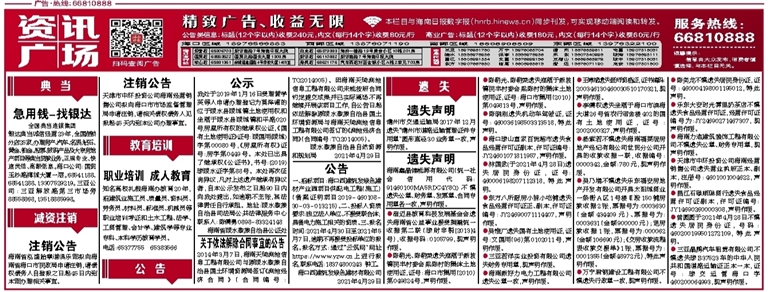 天津市中环投资公司海南经营销售公司拟向海口市市场监督管理局申请注销,请相关债权债务人见报起45天内到本公司办理事宜。