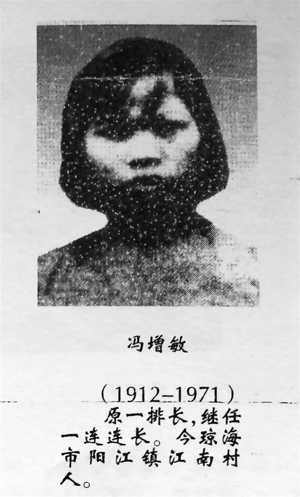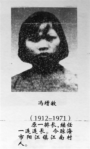 在坐牢的红色娘子军战士中,要数冯增敏的年龄最小。虽然受了国民党在狱中的多年“感化”,但出狱不久,她还是坚定地选择跟党走,还嫁给一名红军战士。怀孕后,丈夫在战斗中牺牲, 她把“遗腹女”抚养到几岁后,狠下心把女儿送了人,又怀着对日本侵略者的刻骨仇恨,义无返顾地投身于抗日斗争。