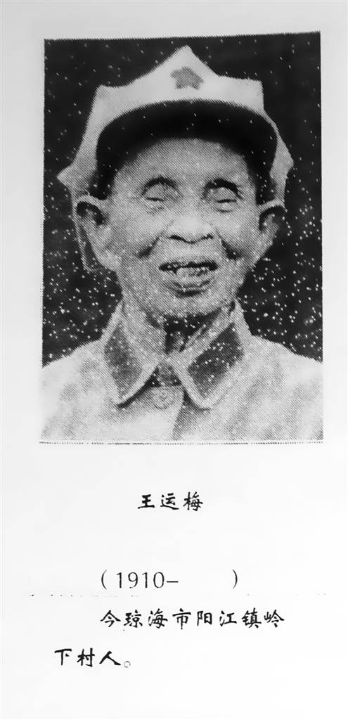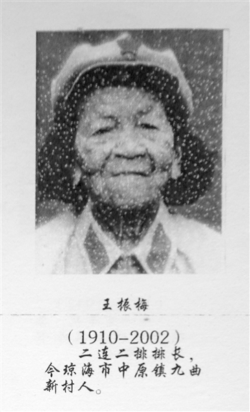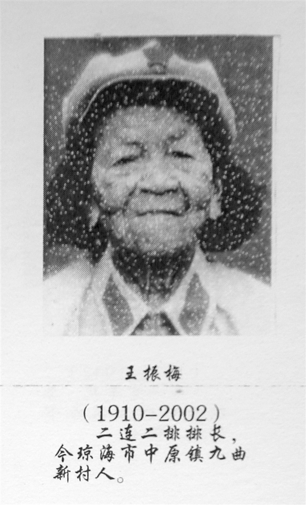 在电影《红色娘子军》里,有这样一个场景,一位女战士背着孩子赴战场,而这位女战士的人物原型就是红色娘子军中曾担任排长的王运梅。那是1932年8月,为躲避国民党军的再次“围剿”,琼崖红军决定向母瑞山转移以保存革命力量。怀孕的王运梅在跟随大队行至母瑞山附近时分娩,在用树叶临时搭起的产棚里产下一名男婴。