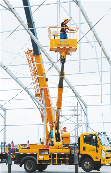 4月29日下午,位于海口市国家帆船基地公共码头的首届中国国际消费品博览会游艇展施工现场,工人在进行展棚搭建。