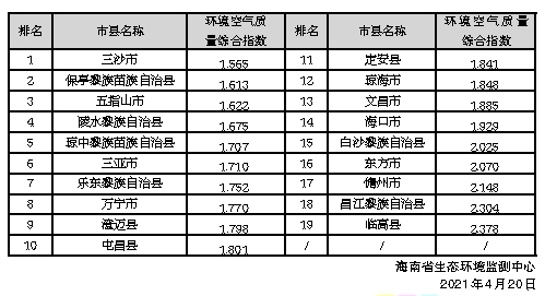 环境空气质量排名靠前的市县分别是三沙市、保亭黎族苗族自治县和五指山市,排名靠后的市县分别是临高县、昌江黎族自治县和儋州市。2021年3月全省19个市县环境空气质量排名如右图: