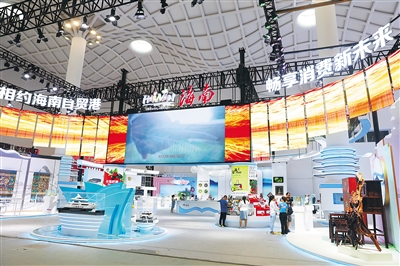 记者来到海南馆时,几名工人正在调整座椅、展台。海南展馆形象新颖,主体色调为蓝白相间,充满了科技感和海南特色。两侧的贝壳用水墨画装饰,淡雅而不失大气。悬挂在正上方的巨大屏幕循环播放海南自由贸易港形象宣传片,为展馆增添气氛。