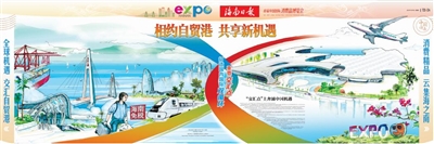 长幅手绘。创新采用长幅原创手绘的形式,结合自贸港建设元素,体现海南特色、彰显开放姿态。