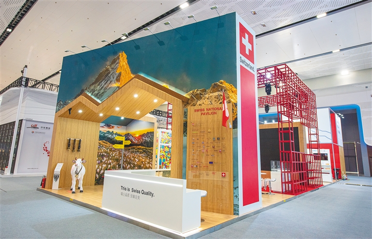 当看到一只瑞士“奶牛”在风景秀丽的瑞士“阿尔卑斯山”前休憩时,映入眼帘的就是瑞士国家馆。作为首届消博会唯一主宾国,瑞士国家馆展台将展示瑞士创新和生活方式领域最具代表性的元素。作为瑞士国家馆两大合作伙伴之一,瑞士钟表集团斯沃琪将在瑞士馆内呈现一个别致的互动空间,观众可以通过其线上平台的创意空间打造个性腕表。