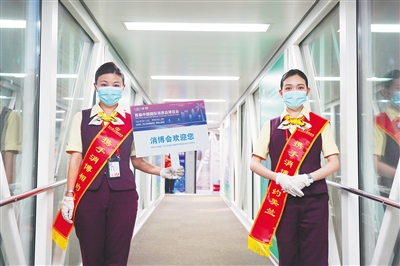 ① 5月5日,海口美兰国际机场飞机到达廊桥上,工作人员佩戴绶带迎接来琼参加首届消博会的参展参会人员。本报记者 封烁 摄