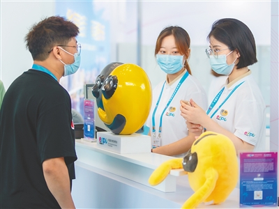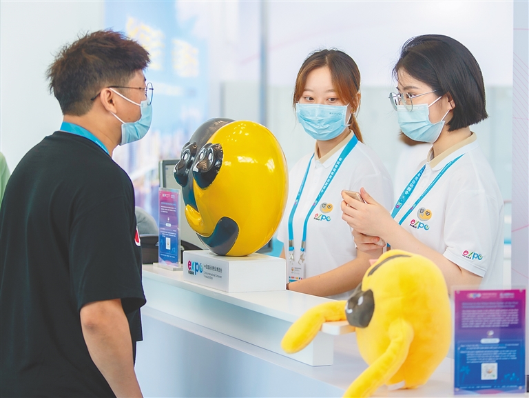 ③ 5月5日,海南国际会展中心,两名志愿者(右)在为参展人员提供咨询服务。 本报记者 袁琛 摄