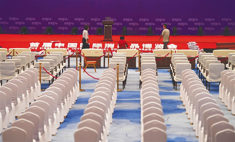 ⑥ 5月5日,海南国际会展中心二期会议中心,工作人员在布置首届消博会场地。本报记者 王凯 摄