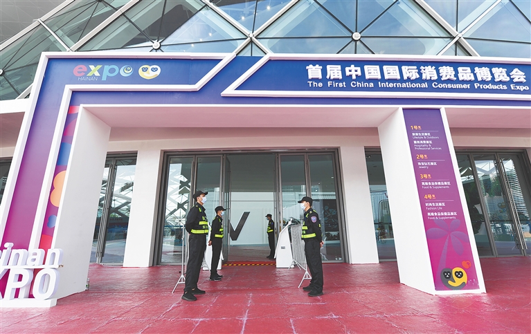 ② 5月4日,海南国际会展中心,安保人员在首届消博会展馆入口处值守。本报记者 王凯 摄