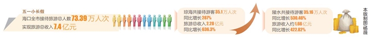 为满足市民游客旅游需求,增强旅游体验感,海口各大景区纷纷推出精彩旅游活动。长影环球100奇幻乐园推出吃喝玩乐一条龙、一家老小一站式全新玩法,大型花车巡游、大手牵小手8项全能竞技运动比赛;观澜湖冯小刚电影公社推出海南首届沉浸式动漫展和“侧耳倾听”音乐会、风起南洋动漫舞台剧等多种形式丰富的表演;海南热带野生动植物园推出“化身小小保育员,体验国家一级保护动物—海南坡鹿的照顾”活动;骑楼老街推出《狮王》主题立体特展,让现场观众拍手叫绝。数据显示,“五一”小长假,海口全市接待旅游总人数73.39万人次,实现旅游总收入7.4亿元。