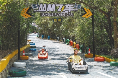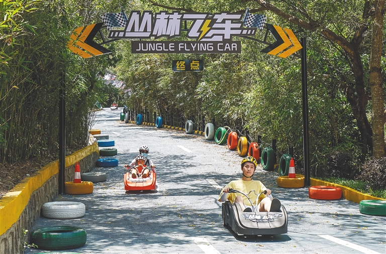 5月4日,游客在三亚大小洞天景区体验新开放的丛林飞车项目。据介绍,丛林飞车项目全长约800米,依托蜿蜒坡道崎岖地形,最高速度可达每小时50千米。据悉,该景区推出悬崖秋千、时光魔毯、海上娱乐等新项目,旅游项目更多样。