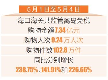 据海口海关统计,5月1日至5月4日,海口海关共监管离岛免税购物金额7.34亿元,购物人次9.24万人次,购物件数102.8万件,同比分别增长238.75%、141.91%和226.66%。