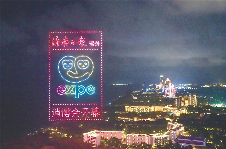 5月6日19时50分,由海南日报、南海网、南国都市报联合一飞(海南)科技有限公司举办的无人机表演秀在三亚海棠湾的复星旅文·三亚亚特兰蒂斯上空上演,1111架无人机用一场炫酷飞行为首届消博会献礼。
