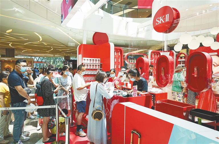 海南日报记者在现场看到,“SK-II”品牌快闪店人气十足,有人在试用护肤品,有人在进行肌肤检测,有人在和售货员交流,门店外等待付款的游客也排起长龙。“5月4日和5日是返程高峰,人流量较前两天有了明显的增长。”“SK-II”品牌快闪店工作人员介绍,付款排队人数较多时,会引导顾客到其他柜台付款。