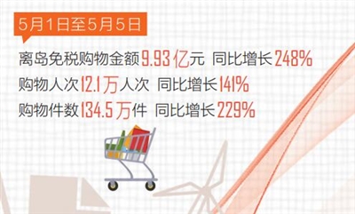 海南是“五一”假期旅游度假的热门目的地,也是消费购物的热门目的地。当免税购物遇上“五一”,擦出更热烈的“火花”。据海口海关统计,5月1日至5月5日,海口海关共监管离岛免税购物金额9.93亿元,购物人次12.1万人次,购物件数134.5万件,同比分别增长248%、141%和229%。
