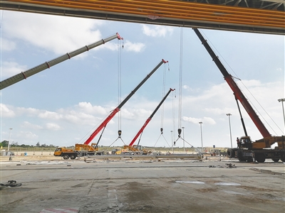 据了解,1号大修定检机库大门属于高推拉门,长156.6m、高21m,共1樘8个独立门扇,每扇重27吨。此次大门吊装采用2台100吨汽车吊车为主吊进行双机抬吊,3台50吨汽车吊车为辅助进行大门移位、吊装。1号机库大门吊装完成,标志着整个机库单体实现整体封闭,项目进入内部设备安装及细部装修施工阶段。