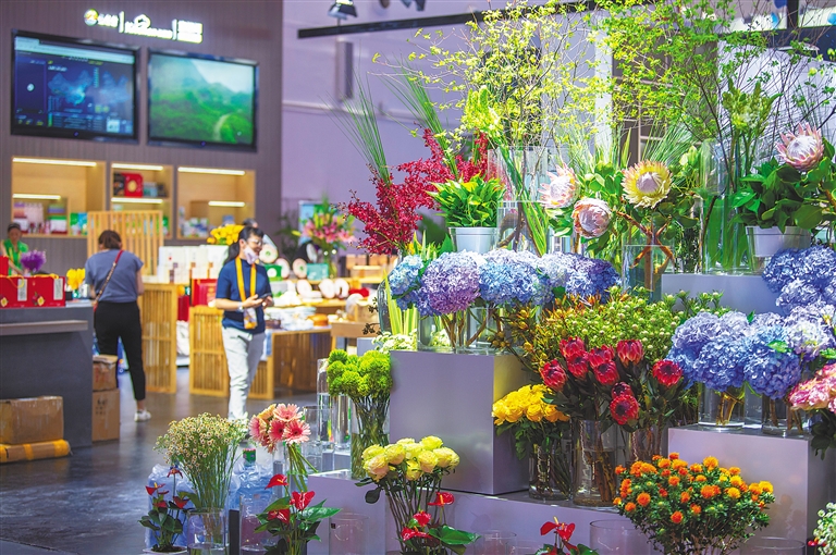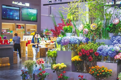 本报海口5月7日讯 (记者孙慧)“好香好香呀!”5月7日上午,在首届中国国际消费品博览会7号馆,人们刚走进云南展区,就闻到了阵阵花香。红色、白色、粉色等各种颜色的花束摆放在云南展区门口,香气四溢,加上深浅的灯光照耀,营造出一种浪漫自然的氛围。