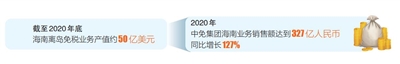 “我们第一时间响应离岛免税新政策落地,实现在海南‘三地五店’的广布局,以及‘空、海、铁’三类离岛旅客的全覆盖,并协同全球合作伙伴,以离岛免税助推消费转型升级。”中国旅游集团有限公司董事长万敏介绍,2020年中旅集团旗下的中免集团海南业务销售额达到327亿元,同比增长127%。