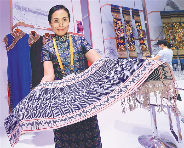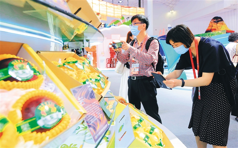五月八日,首届中国国际消费品博览会海南馆内,观众络绎不绝。图①为观众对着海南特色农产品拍照。图②为参展商展示黎锦。
