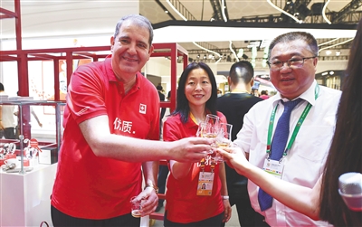 瑞士馆展台中外嘉宾庆祝合作成功。本报记者 王凯 摄
