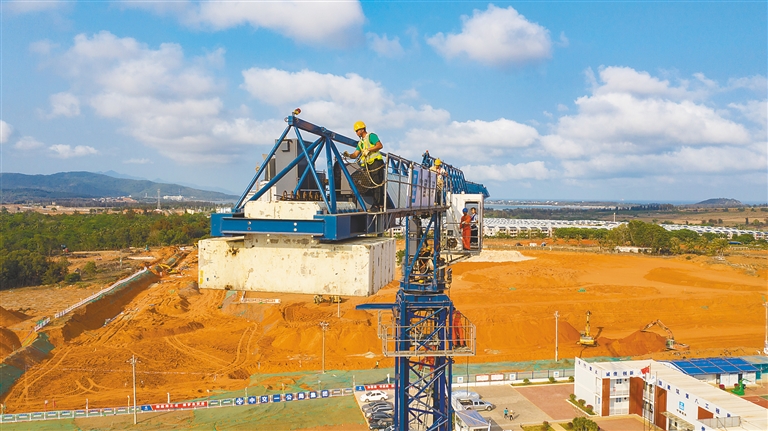 | 在陵水黎安国际教育创新试验区项目建设现场,工人检修塔吊。本报记者 李天平 摄 |
