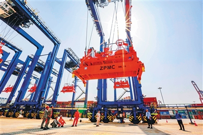 | 在洋浦经济开发区国际集装箱码头起步工程能力提升项目施工现场,工作人员正安装设备。该项目总投资约7.8亿元,建设内容包括新建集装箱堆场、装卸设备采购、设备自动化改造等。本报记者 陈元才 摄 |