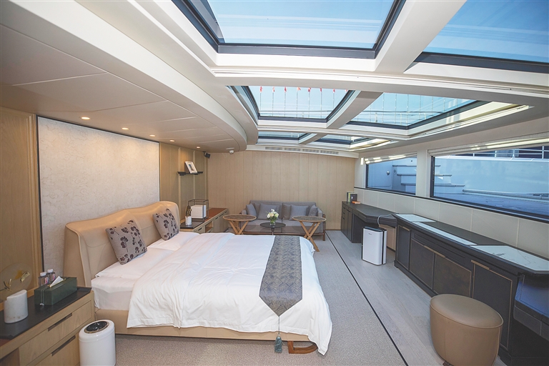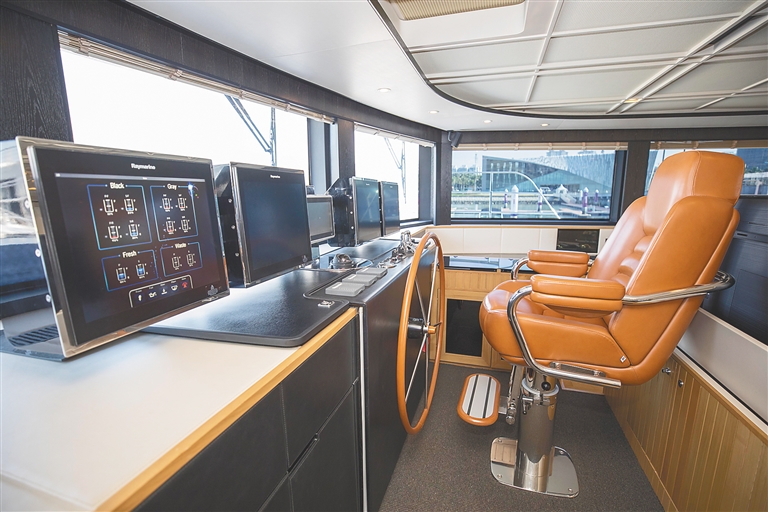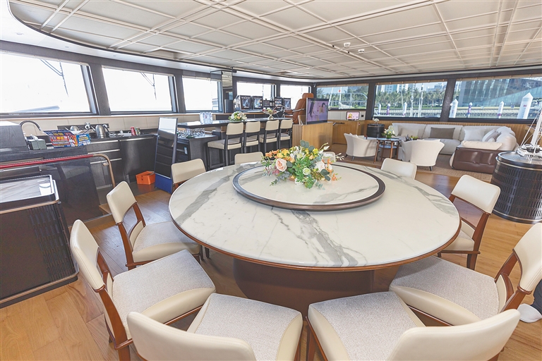 笔者在海口市国家帆船基地公共码头看到,锦龙46米超级游艇共4层,艇内有书房、健身房、KTV、酒吧等,各种设备一应俱全,犹如一个“可移动的海上私人别墅”,格外吸引人眼球。