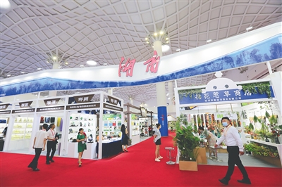 海南日报记者在展馆内看到,现场有以华文食品、湖南果秀为代表的休闲食品区,以湖南华联、醴陵陶润为代表的陶瓷产品区,以迅达科技为代表的电子电器区,以益阳茶厂为代表的五彩湘茶区,以张家界富源、夏花仿真花为代表的仿真花展示区。