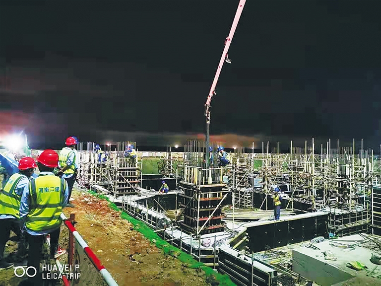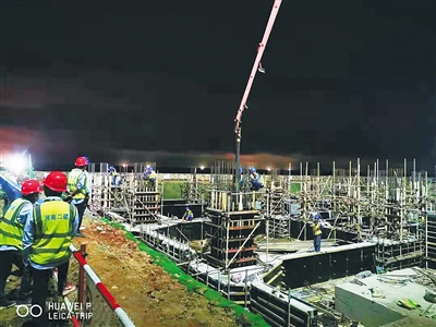 面对紧张的工期进度,参建单位安排两台挖机从两个作业面同时推进,在不到一天的时间就完成了2轴到1轴区域的土方开挖,给区域腾出了破桩头的作业面。而破桩头的工人仅仅用2天时间,也完成了自己的任务,给钢筋绑扎、模板搭设等工序腾出作业面,为浇筑基础垫层创造条件,这样,通过无缝衔接式的施工,一环扣一环施工。“每天施工到晚上10点多,最多的时候我增加了200多名工人,主要是绑扎钢筋和搭设基础垫层的模板。”云昌锋说,最多时整个项目有300余名工人同时施工,人员和设备的大量投入,大大缩短了工期。
