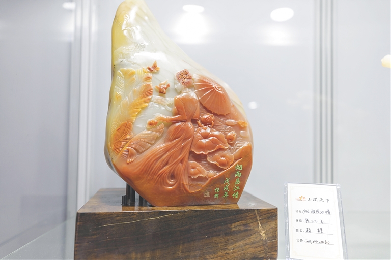在海南国际会展中心2号馆珠宝钻石展区里,经过精挑细选的68件昌江玉摆放在T03展位上,其中16件摆件、17件手把件、原石及带花草原石共35件。尽管周边是世界各地的知名珠宝,昌江玉仍凭借独特的魅力吸引了中外客商的目光。尤其是备受瞩目的《花好月圆》《成就大业》《秋实》等玉雕展品,令客商交口称赞。