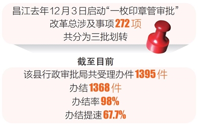 据了解,昌江去年12月3日启动“一枚印章管审批”,改革总涉及事项272项,共分为三批划转。其中,第一批划转事项86项,预计在今年6月底前实现全部事项划转。截至目前,县行政审批局共受理办件1395件,办结1368件,办结率98%,办结提速67.7%。