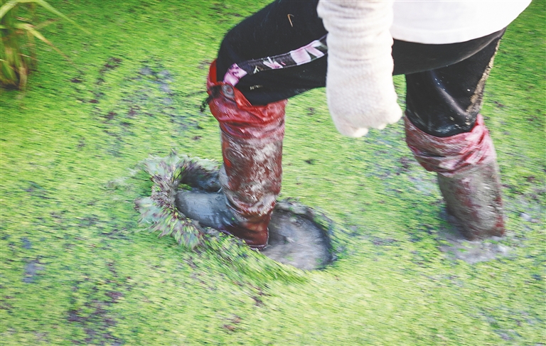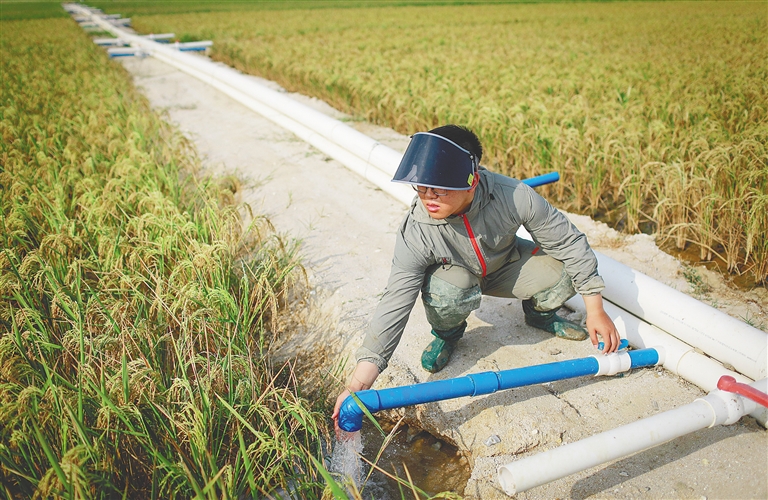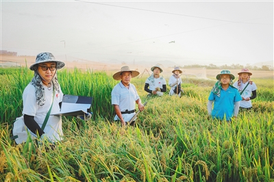 清晨日头刚起,青岛海水稻研究发展中心科研人员张树寅便戴好遮阳帽,一手拿着试验记录本,一手揣着大容量水袋,头也不回地钻进绿色的稻浪,一待就是一上午。