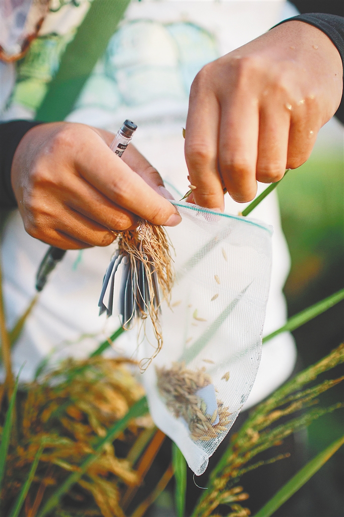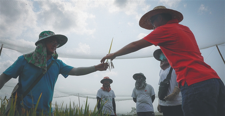 琼岛四月阳光已炙烈如火。三亚国家南繁科研育种基地里颗粒饱满的稻穗压弯了稻秆,张树寅和另外5位同事们例行对稻田进行巡查、选取稻株开展杂交实验、对水稻材料手工脱粒……日复一日。张树寅告诉我们,他们培育一个水稻新品种,平均需要经历8次更新换代才能获得一个稳定的品种。