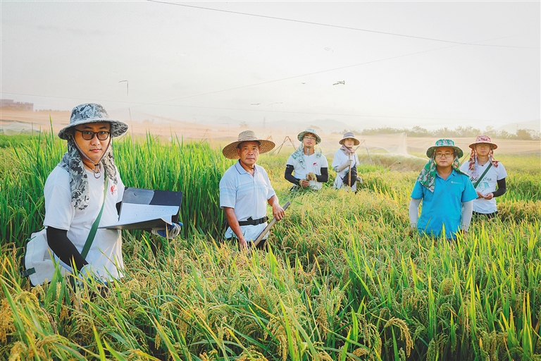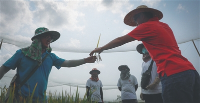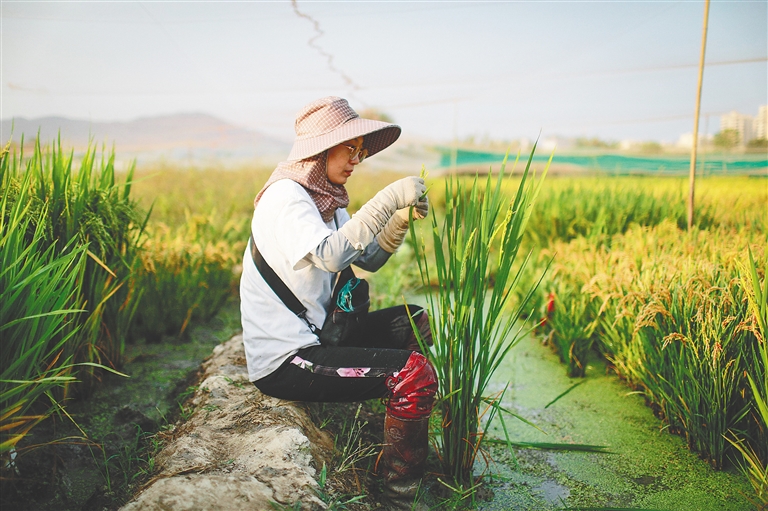 青岛海水稻研究发展中心在三亚国家南繁科研育种基地有近百亩的试验田,里面选育着近2000份水稻种质资源。对于张树寅和他的同事们而言,“我们每一天摸的是水稻,想的也是水稻,这片田里的每一个品种都像是我们的‘孩子’,一天也离不开它们。”