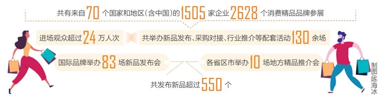 首届消博会各类活动丰富多彩,首发首展首秀亮点纷呈。据统计,共举办新品发布、采购对接、行业推介等形式多样的配套活动130余场,包括主题论坛——全球消费创新暨免税与旅游零售大会、93场新品首发首秀活动、12场采购对接活动以及23场市场化配套活动。其中,国际品牌举办83场新品发布会,各省区市举办10场地方精品推介会,共发布新品超过550个。