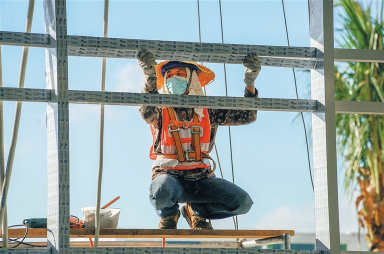 5月10日,在三亚崖州湾科技城中国科学院海南种子创新研究院项目工地,工人正在加紧施工。该项目包含现代育种技术研究空间、分子设计育种公共实验平台和院士工作站3个子项目,计划今年8月底主体完工,2022年5月总体竣工交付。本报记者 武威 摄