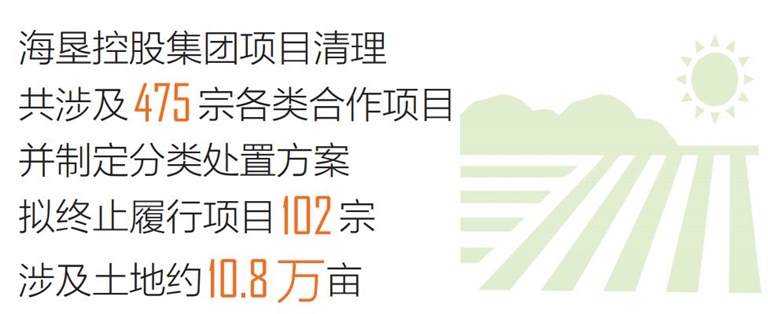 据统计,海垦控股集团项目清理共涉及475宗各类合作项目并制定分类处置方案,拟终止履行项目102宗,涉及土地约10.8万亩,盘活土地资源,为后续发展腾挪了空间。目前取得“清家底、明方向、严要求、有成效”的阶段性工作成果。