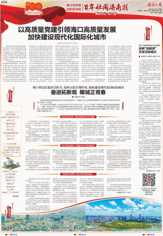 本报讯 (记者陈卓斌)百年恰是风华正茂,琼州大地朝气蓬勃。为庆祝中国共产党成立100周年,本报今日起推出奋斗百年路启航新征程“百年壮阔海南潮·辉煌印记”系列专版,展现在中国共产党的领导下、在自贸港建设的背景下,各市县和洋浦经济开发区取得的重大进展和发展成就,展现繁荣发展、改革创新、人民幸福的生动画面。
