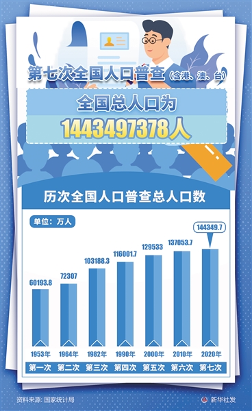 新华社北京5月11日电(记者魏玉坤、邹多为)11日发布的第七次全国人口普查结果显示,全国人口共141178万人,与2010年第六次全国人口普查数据相比,增加7206万人,增长5.38%,年平均增长率为0.53%,比2000年到2010年的年平均增长率0.57%下降0.04个百分点。