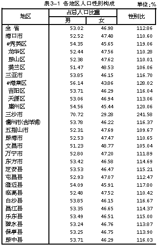 表3-1 各地区人口性别构成