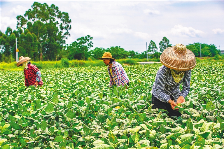 5月12日,位于儋州市东成镇的海南鑫鹏农业有限公司毛豆生产基地的毛豆采摘已近尾声。“摘毛豆辛苦,但赚钱多,我手快,最多时1天收入700元。”来自儋州木棠镇薛宅村的林香女告诉海南日报记者,摘1斤毛豆可获得0.5元劳动报酬,一般从晚上8点开始摘。她和丈夫一起摘,最多时两人1天可领劳务报酬1400元。