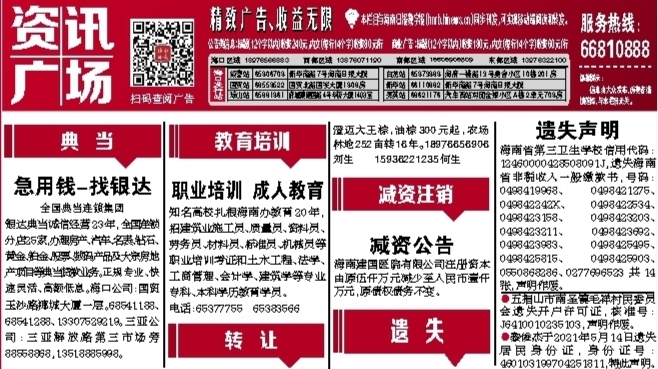银达典当诚信经营23年,全国连锁分店25家,办理房产、汽车、名表、钻石、黄金、铂金、股票、数码产品及大宗房地产项目等典当贷款业务。正规专业、快速灵活、高额低息。海口公司:国贸玉沙路椰城大厦一层。68541188、68541288、13307529219。三亚公司:三亚解放路第三市场旁 88558868,13518885998。