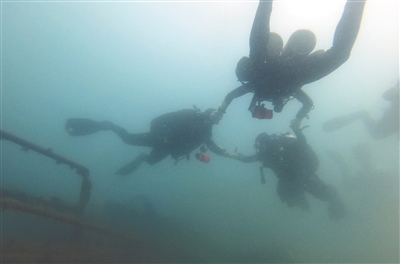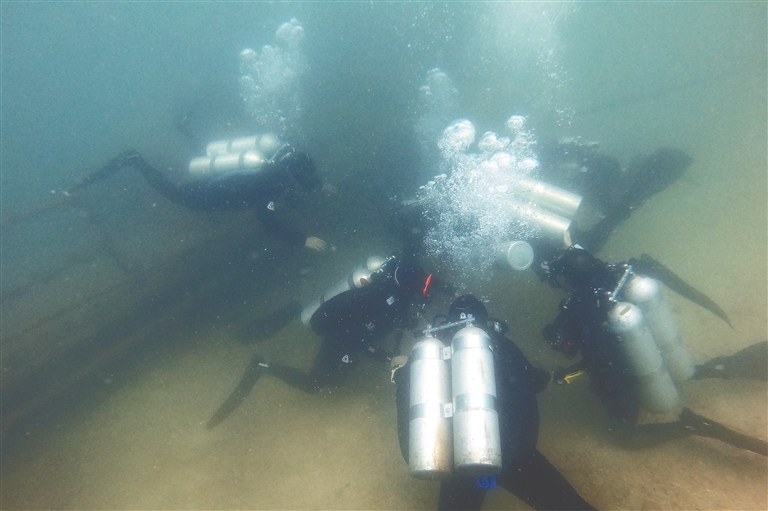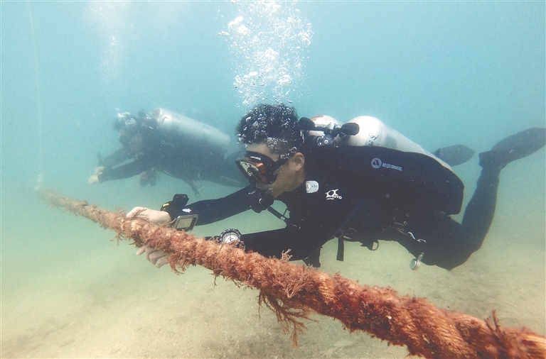 除了良好的身体素质和技术基础,水下考古工作者还必须拥有过硬的心理素质。“陌生的水下环境往往隐藏着风险和变数,在水下会面临各种突发情况,比如气瓶阀漏气、能见度骤降、水底乱流、渔网缠绕等,常会造成心理恐慌,这时候就需要处置紧急情况的能力。所以说,水下考古工作者在身体条件和心理素质方面都是百里挑一的。”梁国庆表示。