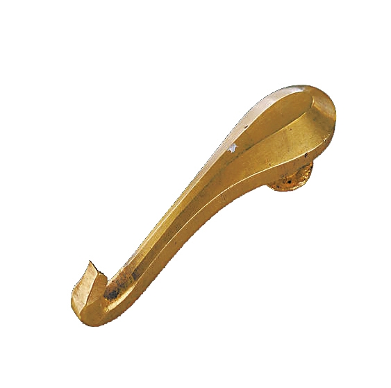 春秋六棱金带钩是国家博物馆“中国古代服饰文化展”中的一件明星文物,常见的带钩多以铜器和玉器居多,像六棱金带钩这样纯金打造的倒不多见。带钩通常由钩首、钩身、钩钮三部分组成,使用时将带钩钮嵌入革带一端,钩首则钩挂在革带另一端的穿孔中,或将钩首穿挂在置于革带另一端的带环上。带钩常见的造型有兽面形、水禽形、琵琶形、曲棒形、竹节形等,六棱金带钩属于水禽形的范畴。
