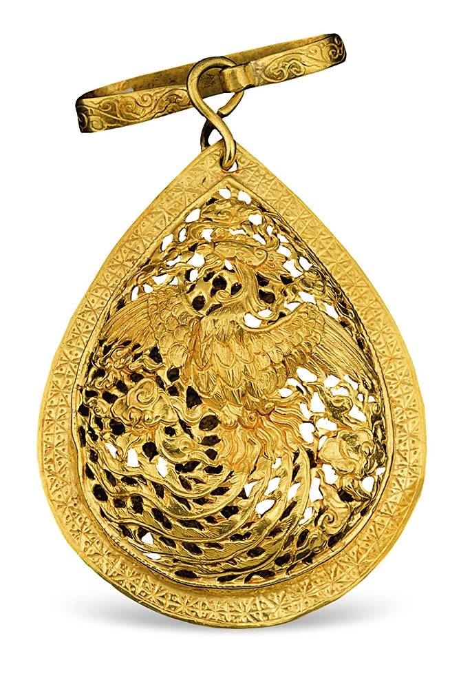 明代的霞帔和帔坠的使用制度沿袭宋代,礼制上更加完备。从湖北省博物馆藏出土于湖北省钟祥市梁庄王墓的一件明宣德金镂空凤纹坠来看,帔坠为纯金制作,主体呈鸡心形,上部有“钓圈”(挂钩),坠体饰以镂空的云凤纹,器钩内壁有“随驾银作局宣德柒年拾贰月内造柒成色金壹两玖钱”铭文,这个铭文表明它是由皇家的银作局制作,属于朝廷的赏赐品。这件帔坠与墓中同出的金花钏和镶宝石金镯相配,都是梁庄王娶妃的礼聘之物,与《梦梁录·嫁娶》中记录的“三金”一致。