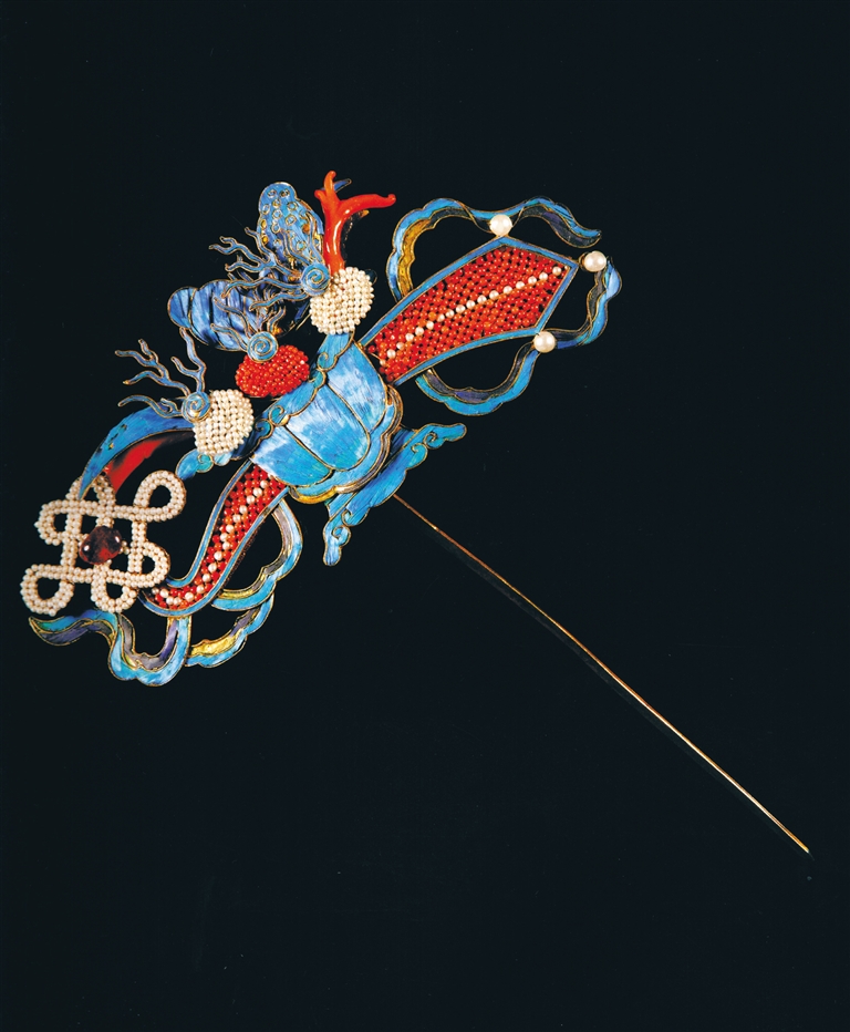 发簪作为女子的爱美之物,古代的能工巧匠将镂空、镶嵌和点翠等工艺施加其上,尤其是点翠工艺,可使发簪呈现翠青、湖绿色、藏青等不同的艳丽色彩,在配合镶嵌工艺缀以珍珠、宝玉石和红珊瑚等,小小的发簪也可透出皇家的雍容华贵。点翠虽美,但要用到翠鸟的羽毛,取翠后翠鸟便会死去,很是残忍,故而现在多用其他羽毛来代替。