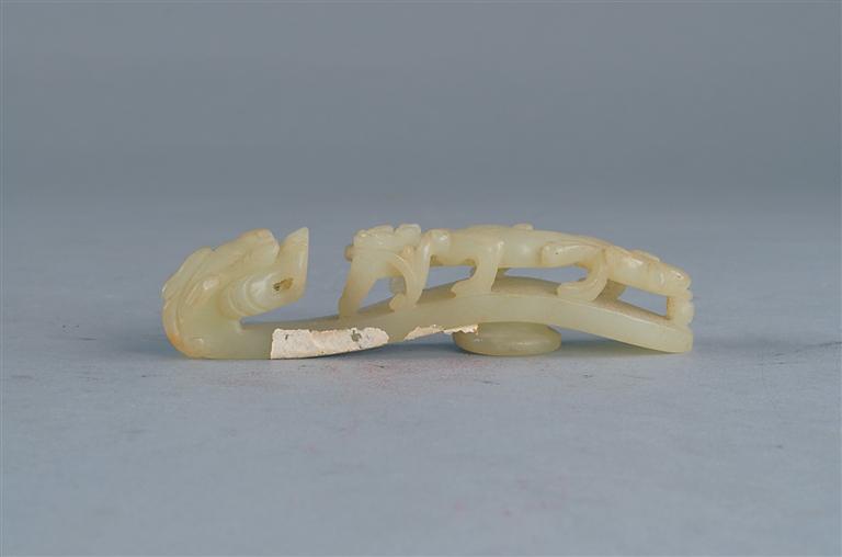 定安县博物馆藏有一件清苍龙教子玉带钩,该带钩钩头为龙首,双角沿额顶伸向颈后,眼珠凸起,阔嘴微张;钩身长而微曲,钩面上浮雕蟠螭,口衔灵芝,呈俯卧爬行状,螭头与龙首相对,钩钮为圆形,有扁圆柱与钩身相接。“苍龙教子”是明清之际很常见的带钩形制之一。记得有些老先生讲,上世纪七八十年代的时候,文物商店的这种带钩非常多,为辨别年代,老先生们一般会用一支铅笔放在两龙相对的缺口处,放得下去的暂定为明代,放不下去暂定为清。当然这种鉴定方法略显粗糙,有些明清之际的玉带钩形制差异不大。不过从大的演变规律来看,由明至清,两龙之间的缺口确实呈逐步变小的趋势,所以老先生的分类倒也有些道理。